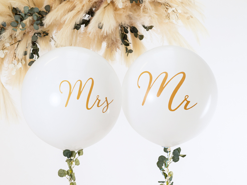 Balony o średnicy ok. 1 m, biały pastelowy ze złotym nadrukiem Mrs i Mr, wentyl umieszczony u dołu, do nadmuchania potrzeba 0,4 m3 helu.