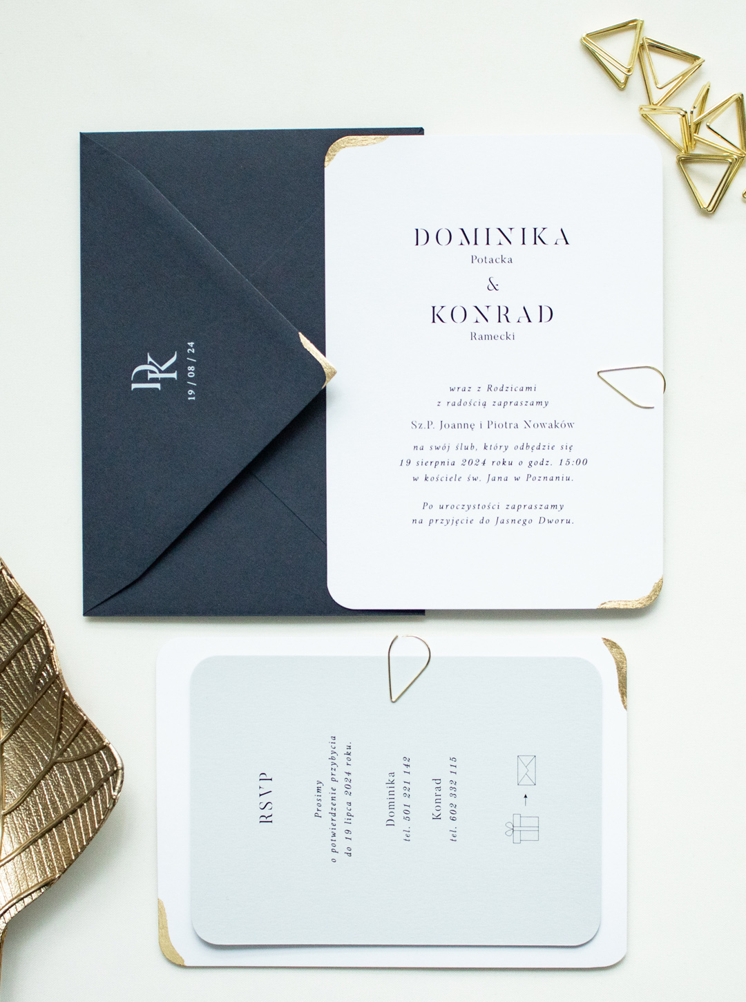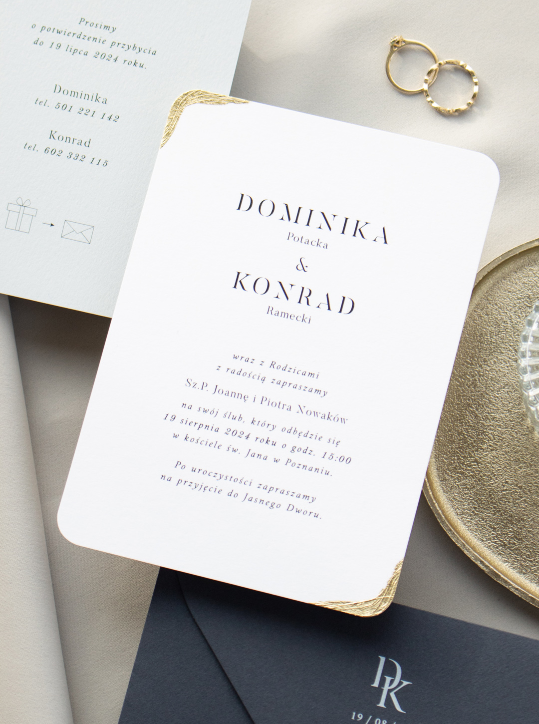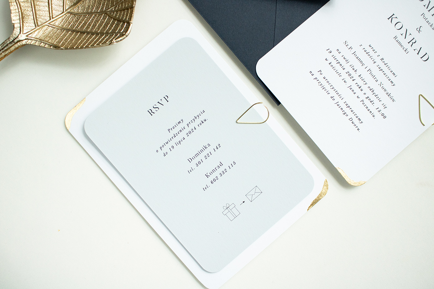 Zaproszenia ślubne wykonane na wysokiej jakości papierze z zaokrąglonym brzegami. Karty zaproszenia zdobione są płatkami złota, całość połączona ozdobną spinką z kartą informacyjną. Możliwość bezpłatnej zmiany koloru koperty lub ozdobnej spinki na złoty sznurek.