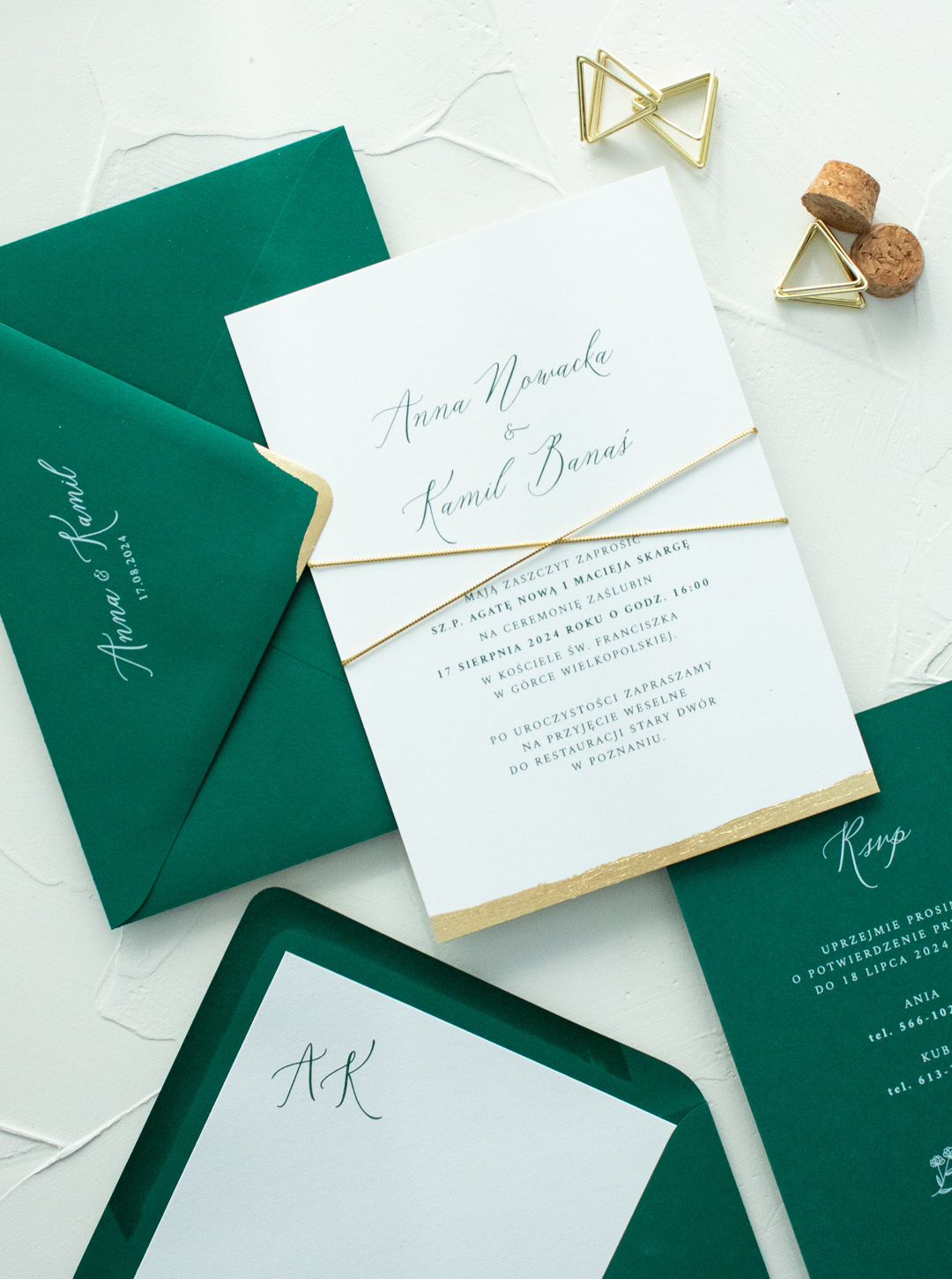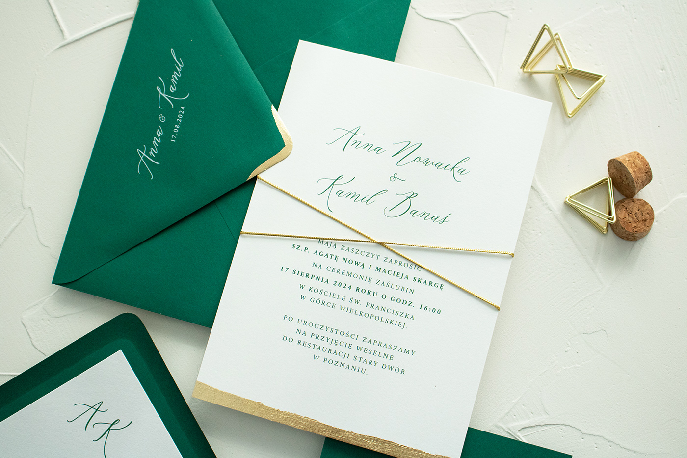 Zaproszenia ślubne zdobione płatkami złota, wykonane na wysokiej papierze o gramaturze 300g. Karty połączone są ozdobnym sznurkiem.
