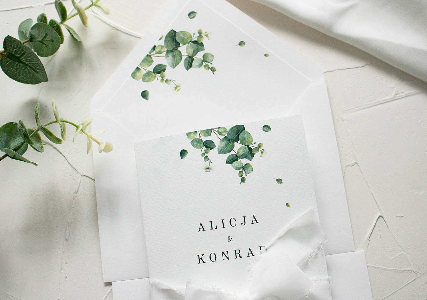 Składane zaproszenia ślubne wykonane na wysokiej jakości włoskim papierze fakturowanym o gramaturze 250g. Wiązane ręcznie rwaną, szyfonową wstążką. Do zestawu koperta w stylu zaproszenia.