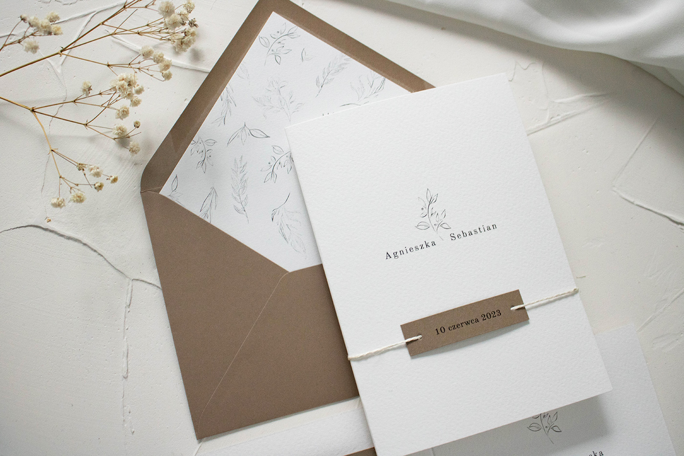 Składane zaproszenia ślubne wykonane na wysokiej jakości włoskim papierze fakturowanym o gramaturze 300g. Wiązane rustykalnym sznurkiem z karteczką z datą. Zaproszenie posiada kieszonkę do umieszczenia karty informacyjne. Do zestawu koperta w stylu zaproszenia.