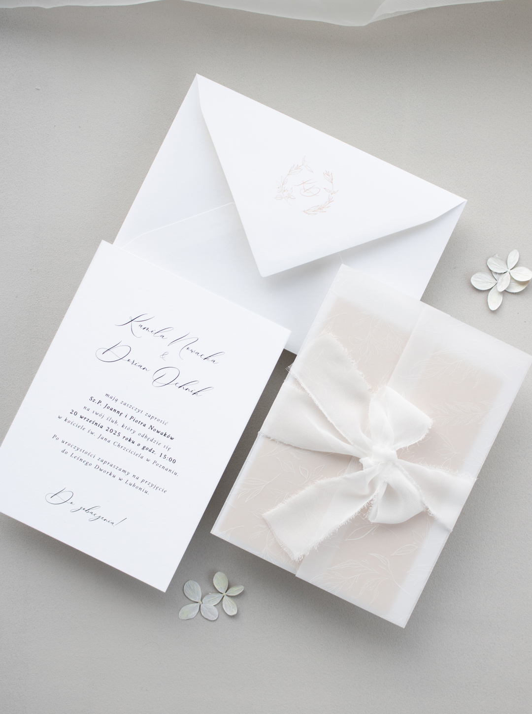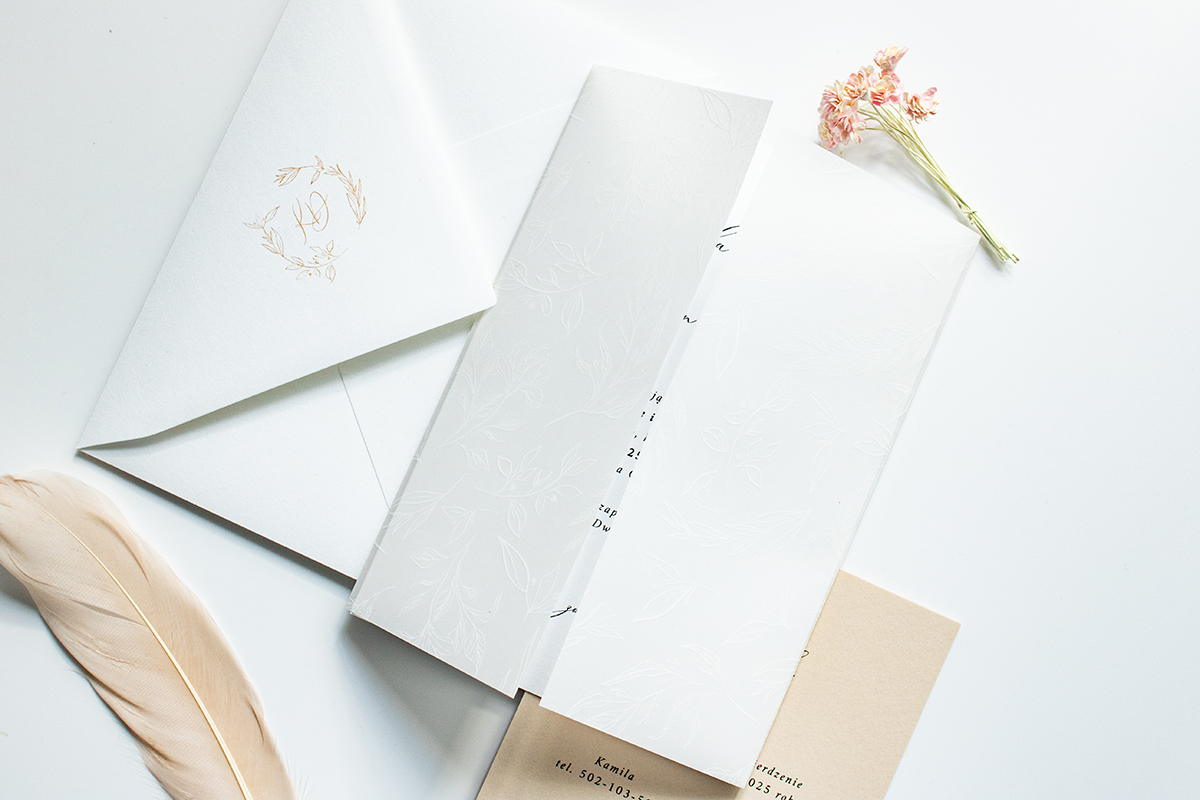 Zaproszenia wykonane na wysokiej jakości papierze o gramaturze 300g. Karta zaproszenia z kartą RSVP umieszczone są w przezroczystej, zdobionej obrysami kwiatów obwolucie (dodatkowo płatnej) wiązanej szyfonową, ręcznie rwaną wstążką.