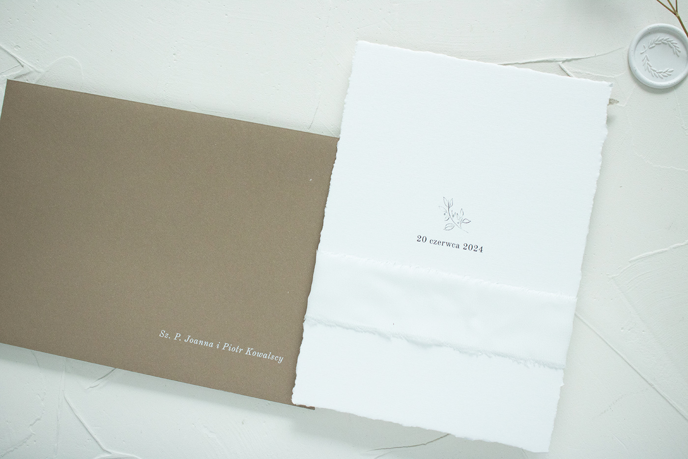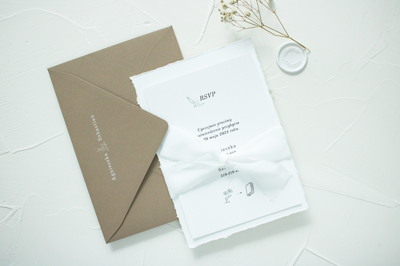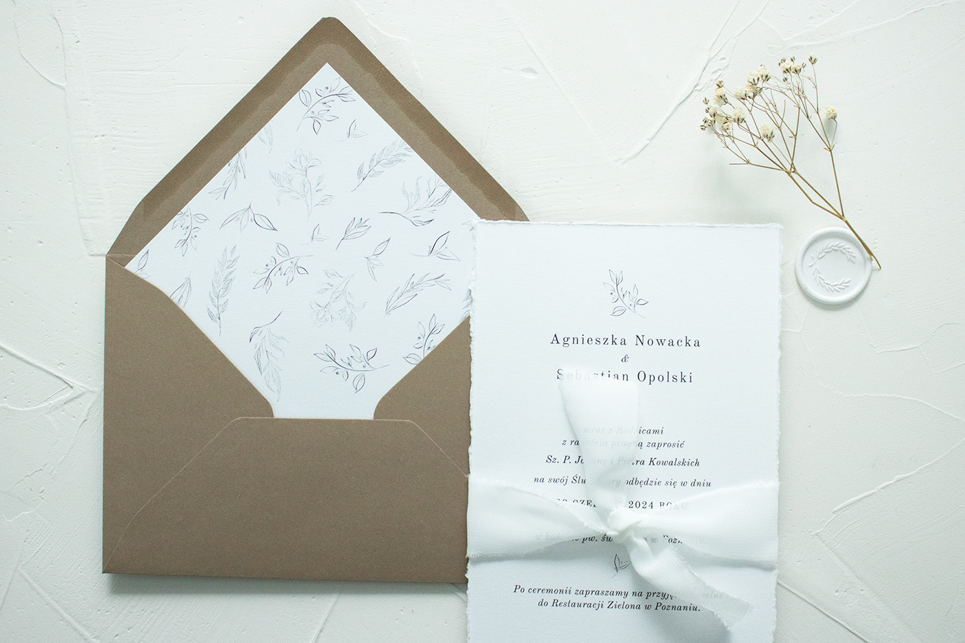 Zaproszenia ślubne wykonane na wysokiej jakości, ręcznie rwanym papierze o gramaturze 300g. Karty połączone są ozdobną, szyfonową wstążką.