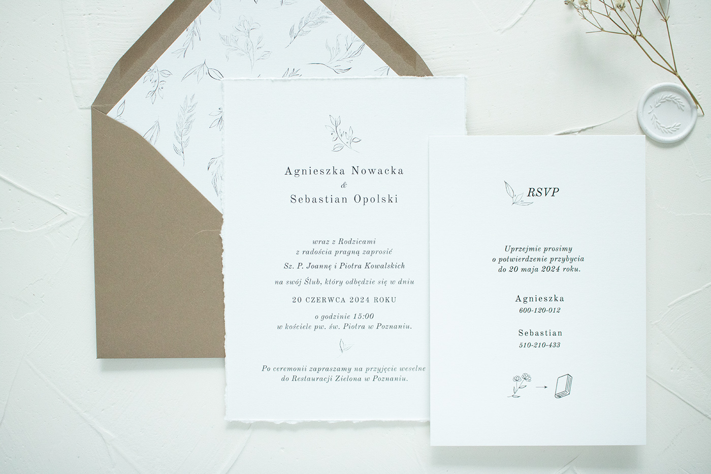 Wymiary zestawu: karta zaproszenia 170x120 mm, karta RSVP: 105x148 mm, koperta B6.