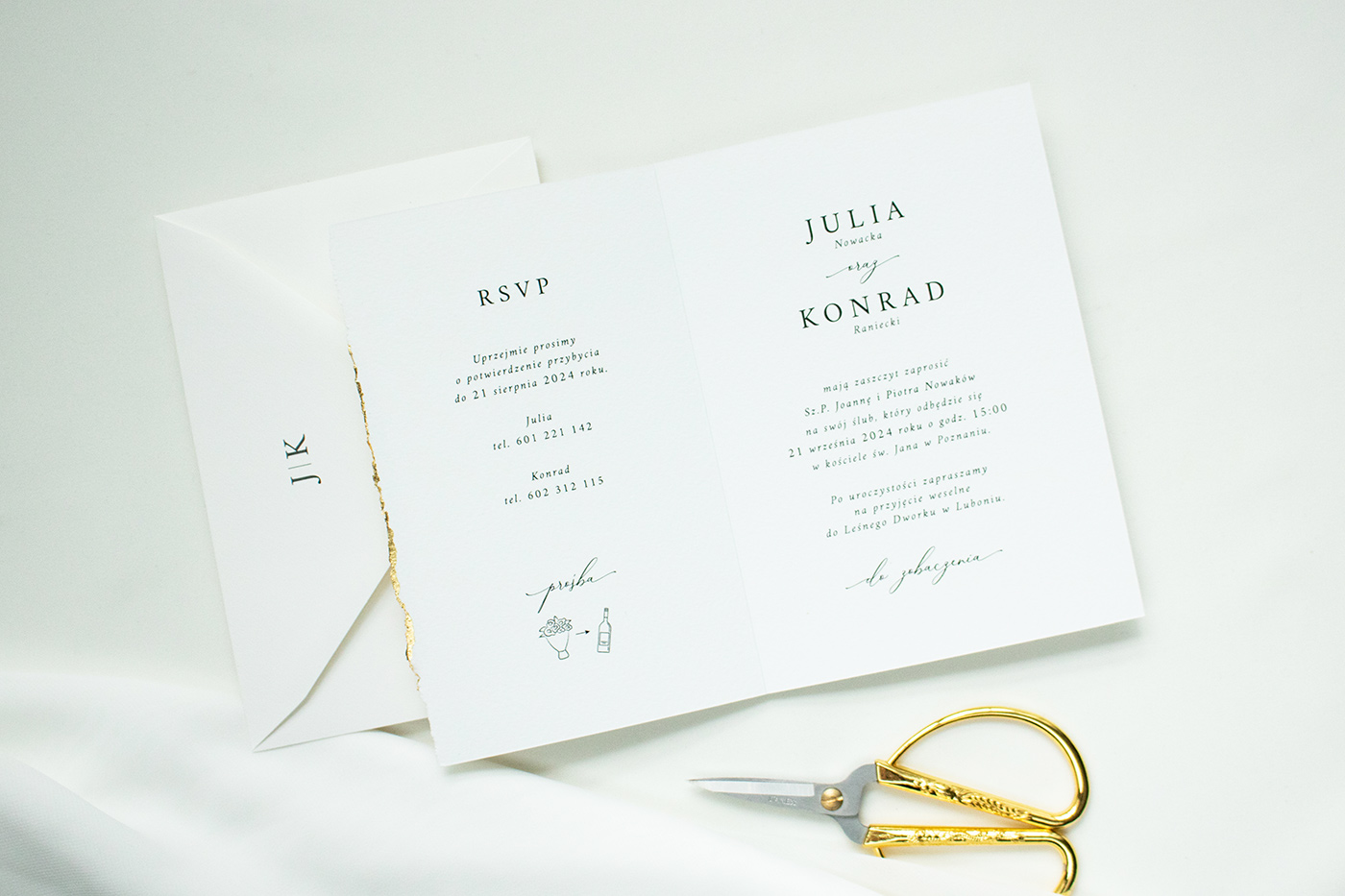 Wymiary zestawu: karta zaproszenia 225x170 mm (po złożeniu 120x170mm) , koperta B6.