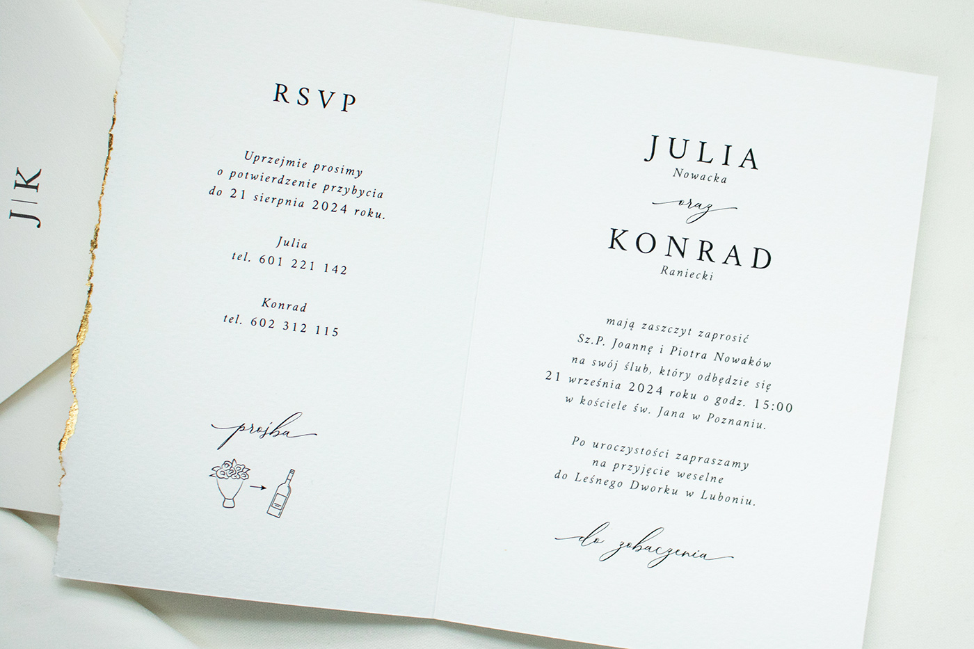 Zaproszenia ślubne wykonane na wysokiej jakości fakturowanym, włoskim papierze. Rwany brzeg składanej karty zdobiony jest płatkami złota, całość połączona złotym sznurkiem.