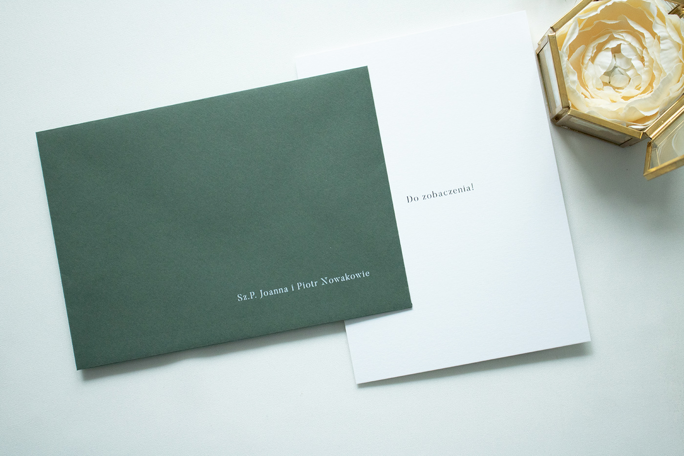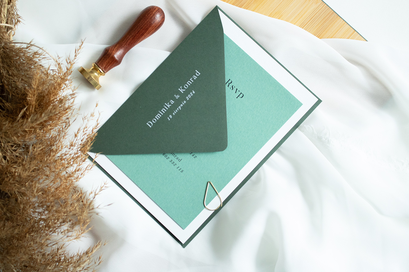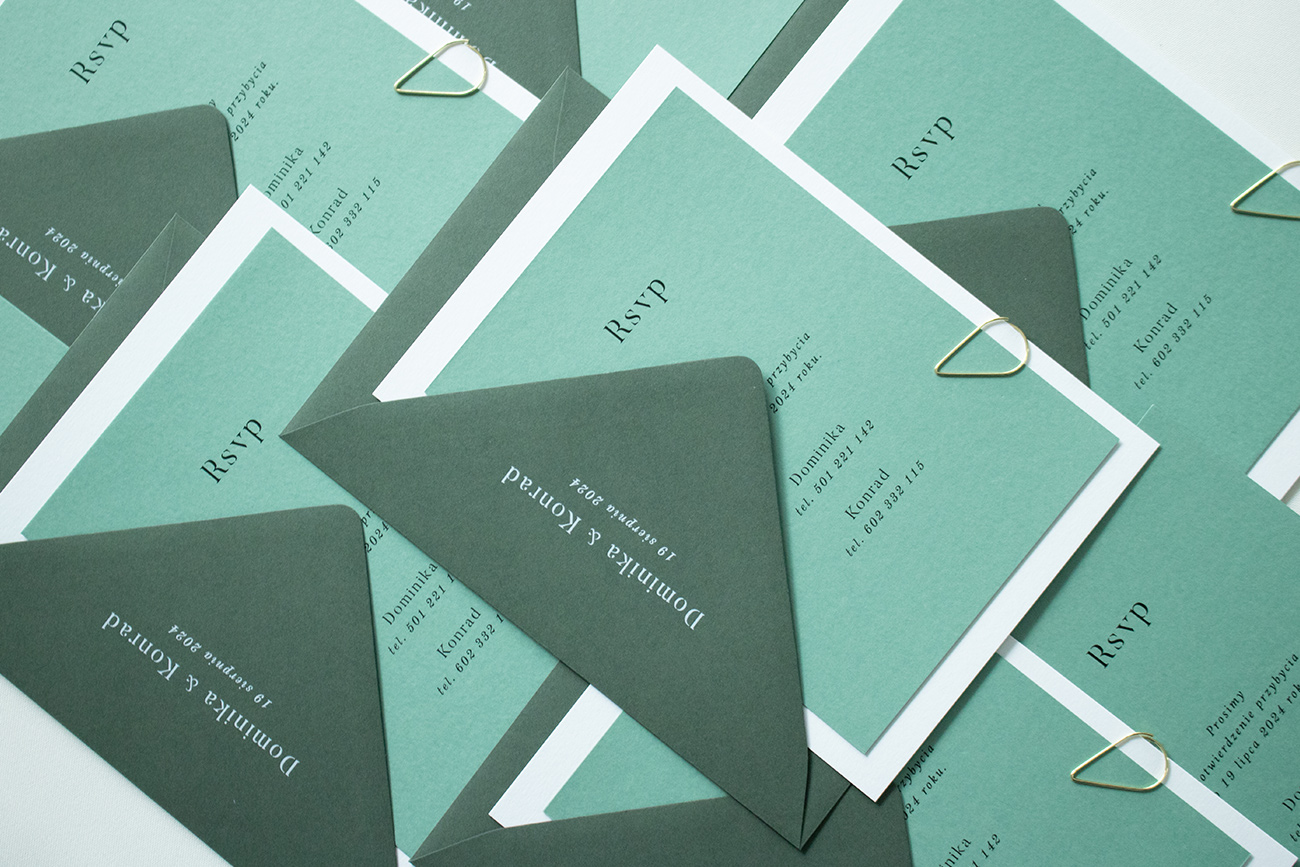 Zaproszenia ślubne wykonane na wysokiej jakości papierze o gramaturze 300g. Karta zaproszenia z kartą RSVP złączone są złotą spinką.