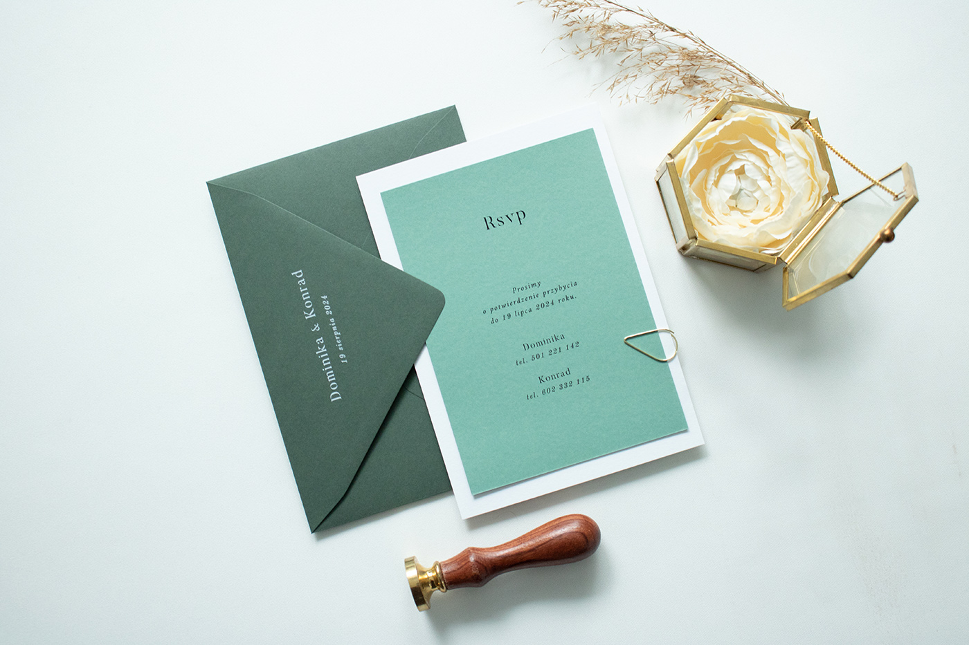 Wymiary zestawu: karta zaproszenia 170x120 mm, karta RSVP: 105x148 mm, koperta B6.