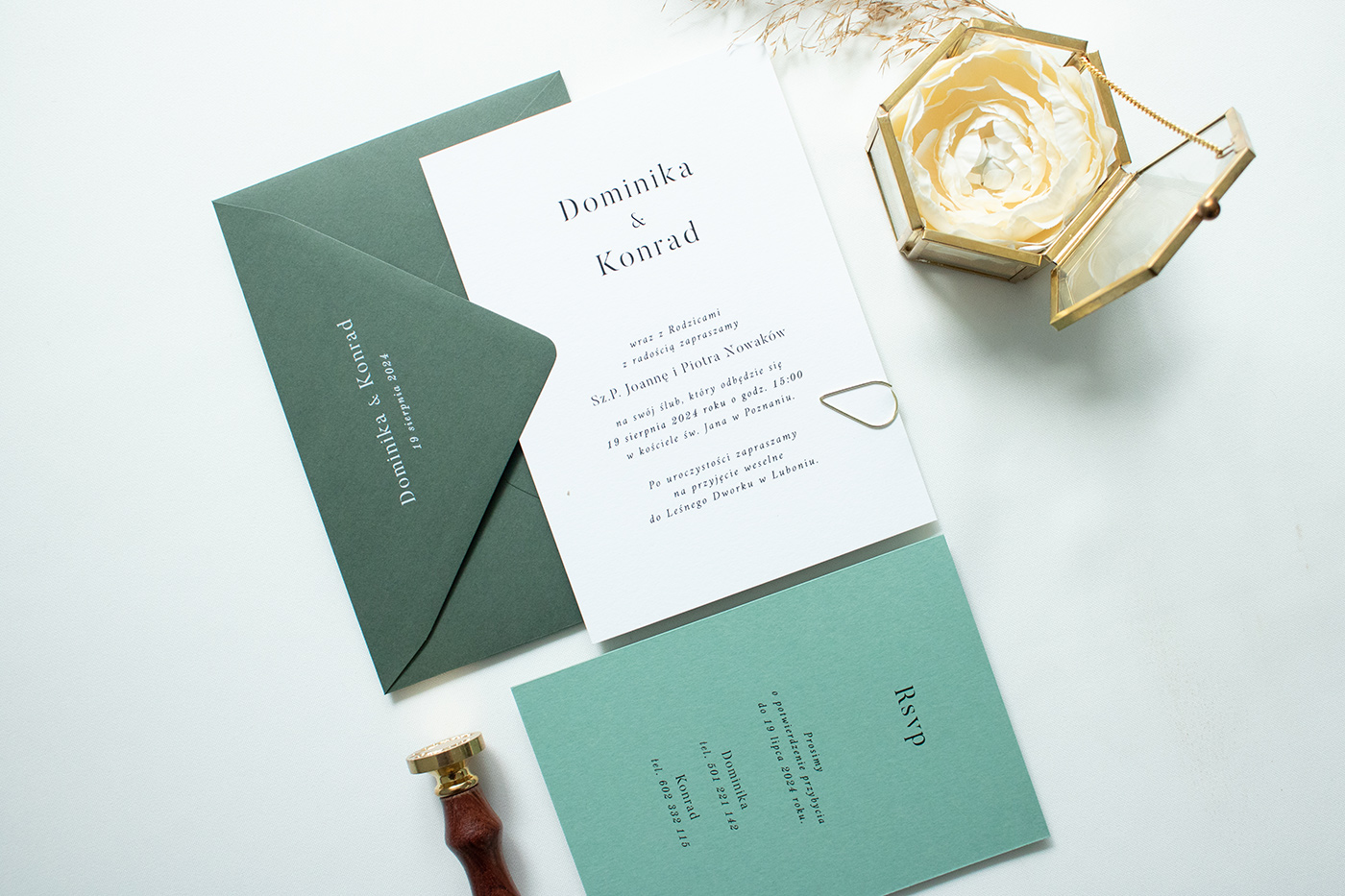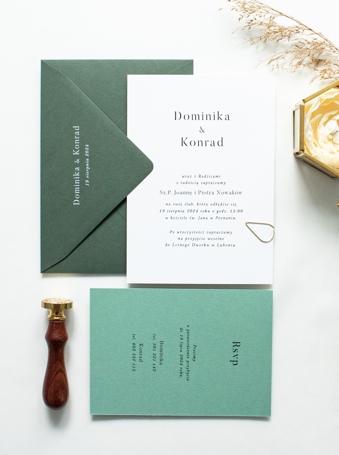 Zaproszenia ślubne wykonane na wysokiej jakości papierze o gramaturze 300g. Karta zaproszenia z kartą RSVP złączone są złotą spinką.