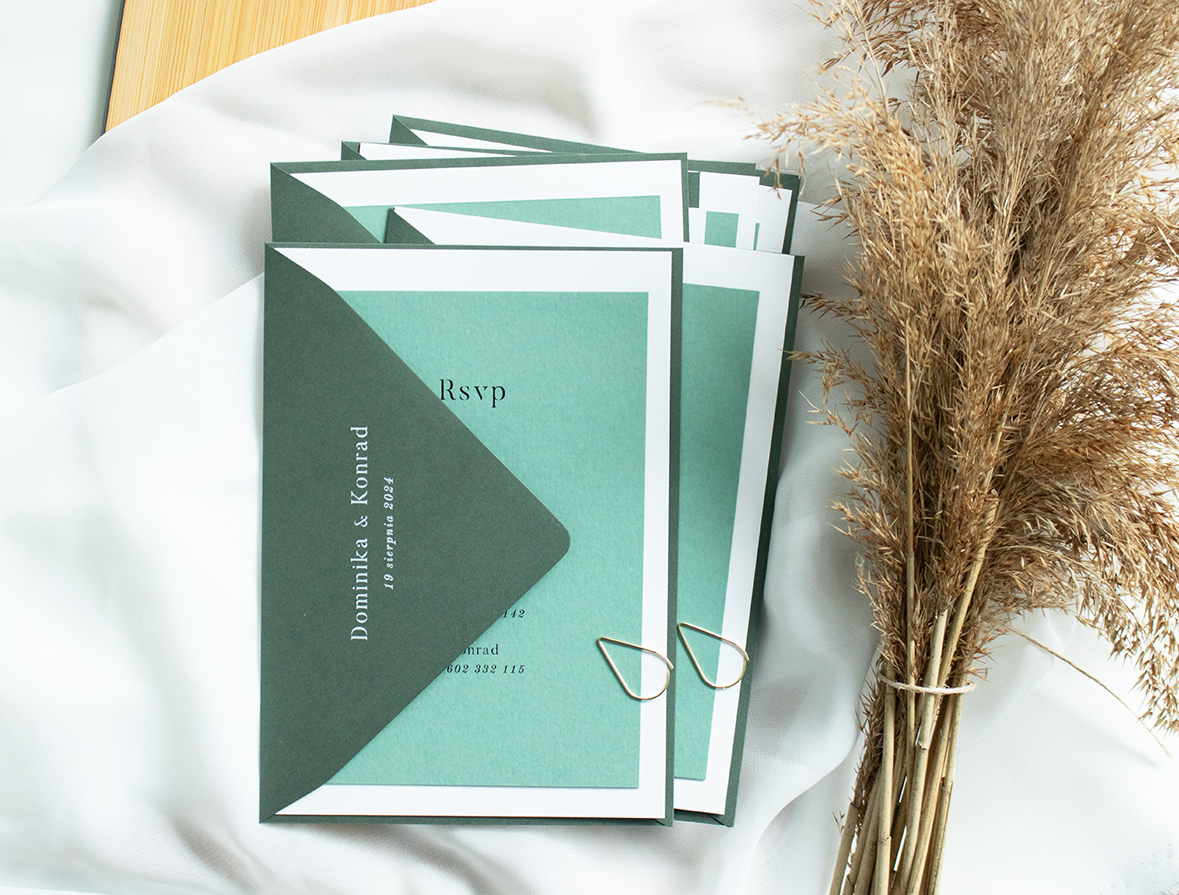 Wymiary zestawu: karta zaproszenia 170x120 mm, karta RSVP: 105x148 mm, koperta B6.