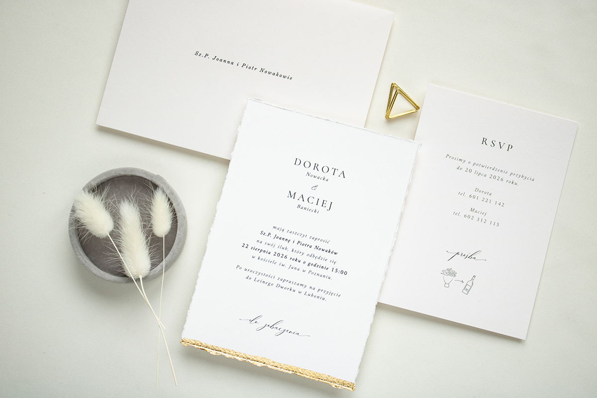 Wymiary zestawu: karta zaproszenia 12x17 cm, koperta B6.