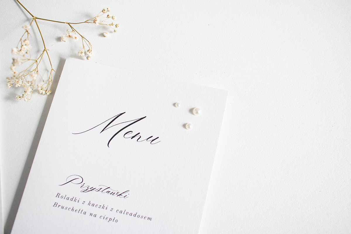 Karta menu wykonana na wysokiej jakości papierze zdobiona perełkami.
