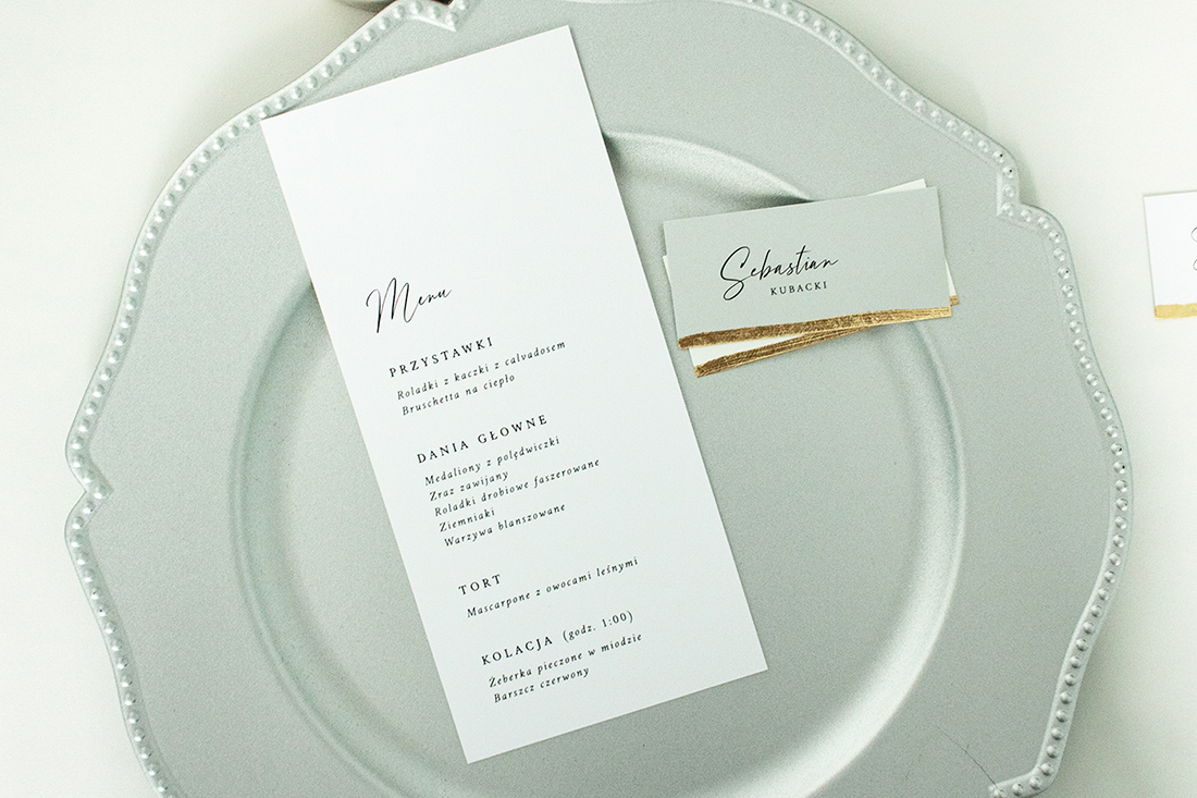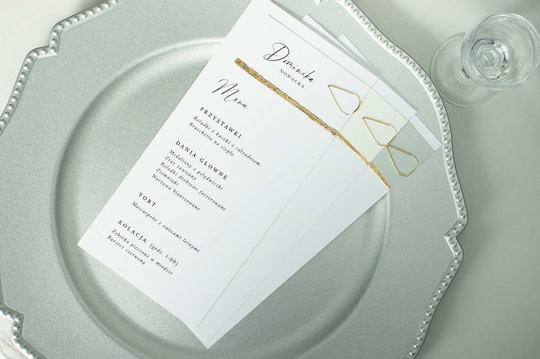 Karta menu z winietką wykonana na wysokiej jakości papierze, połączone ozdobną spinką.
