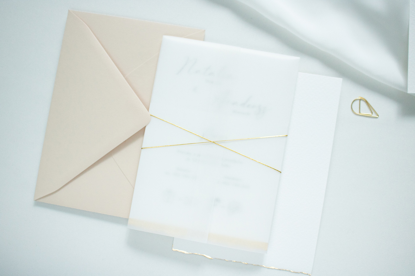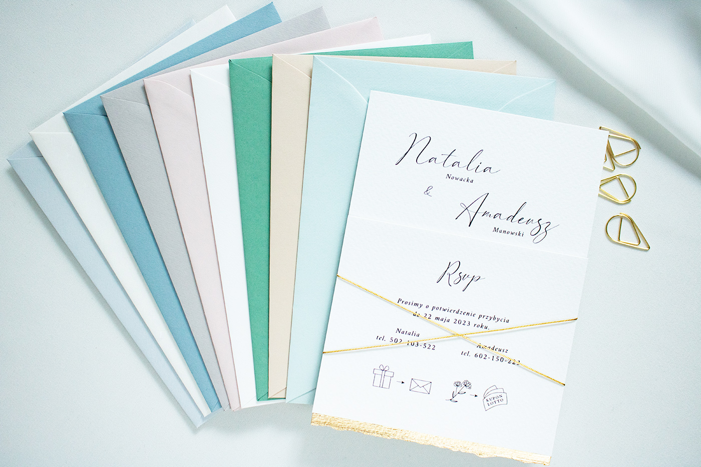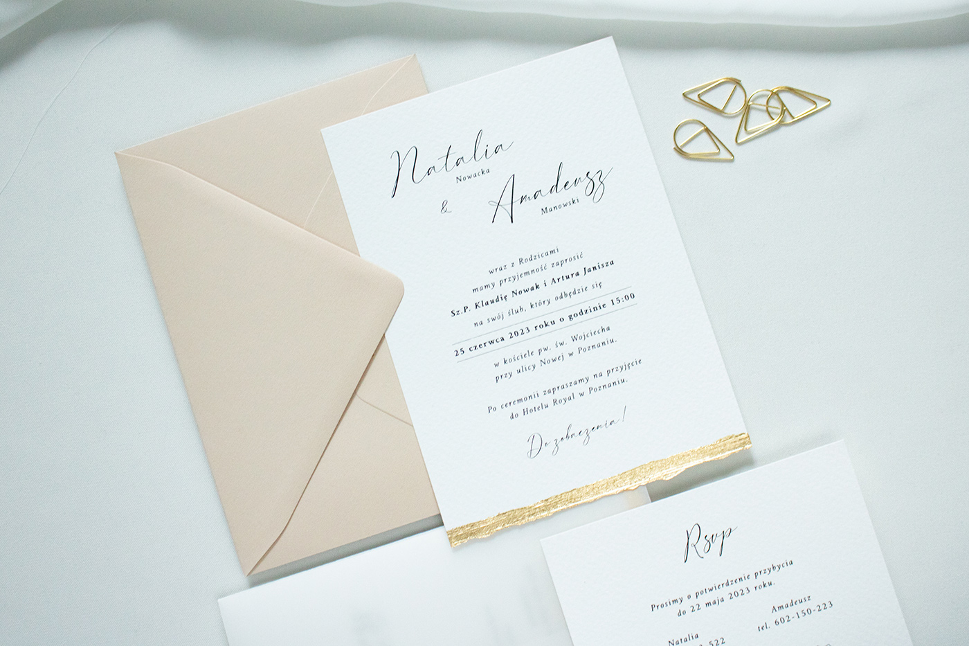 Wraz z kartą RSVP umieszczone są w przezroczystej obwolucie (dodatkowo płatna) wiązanej złotym sznurkiem lub złotą naklejką. Do zestawu zadrukowana koperta w stylu zaproszenia.