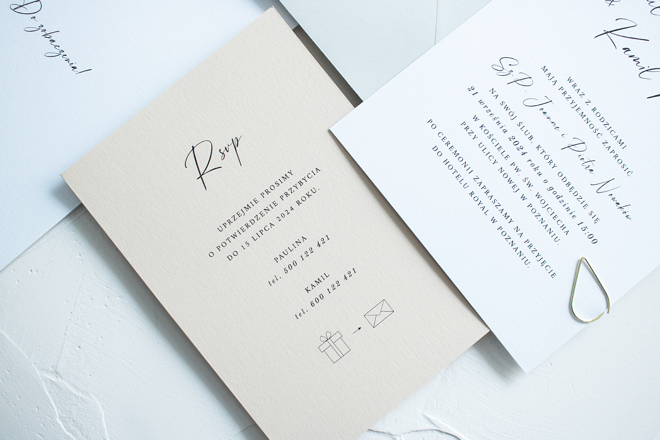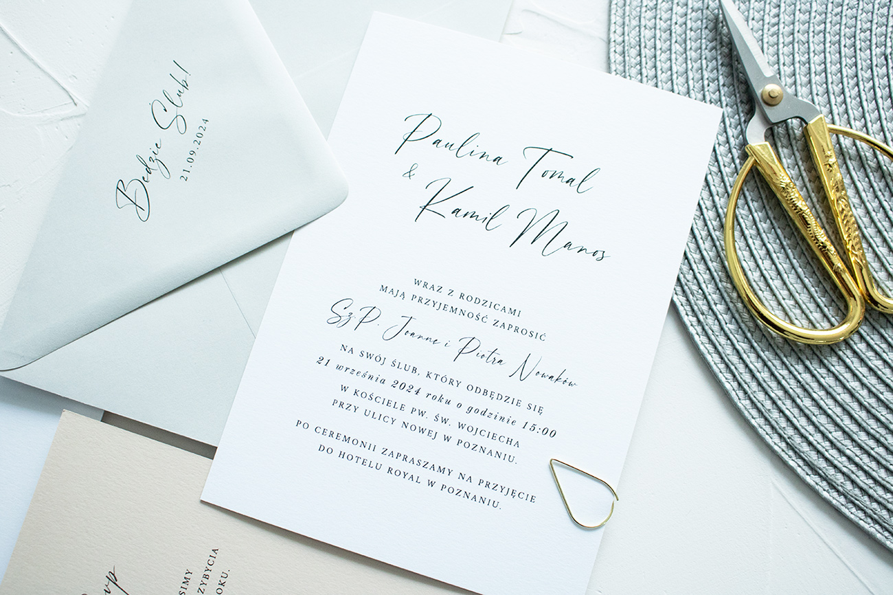 Zaproszenia ślubne wykonane na wysokiej jakości papierze o gramaturze 300g. Karta zaproszenia z kartą RSVP złączone są złotą spinką.
