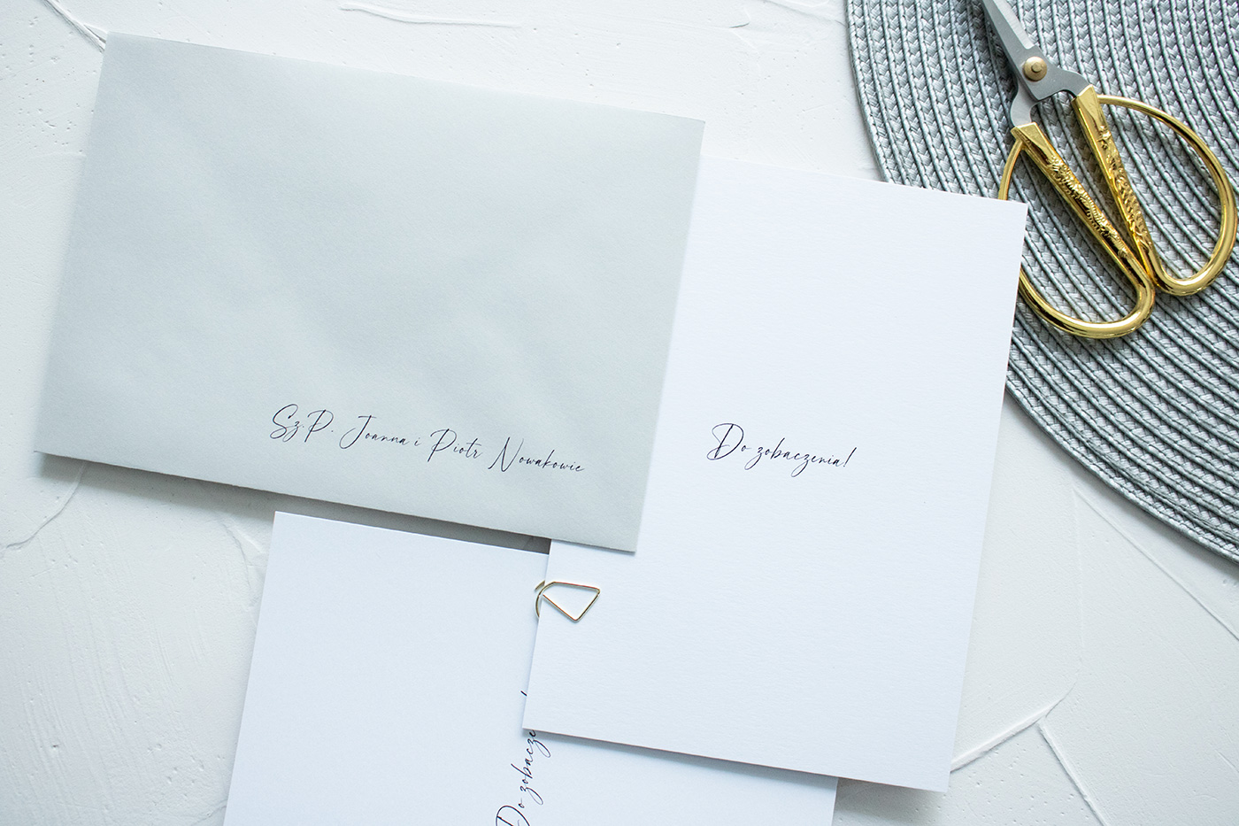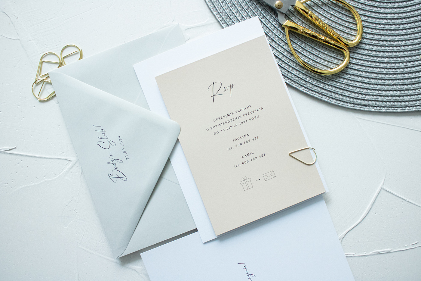 Zaproszenia ślubne wykonane na wysokiej jakości papierze o gramaturze 300g. Karta zaproszenia z kartą RSVP złączone są złotą spinką.