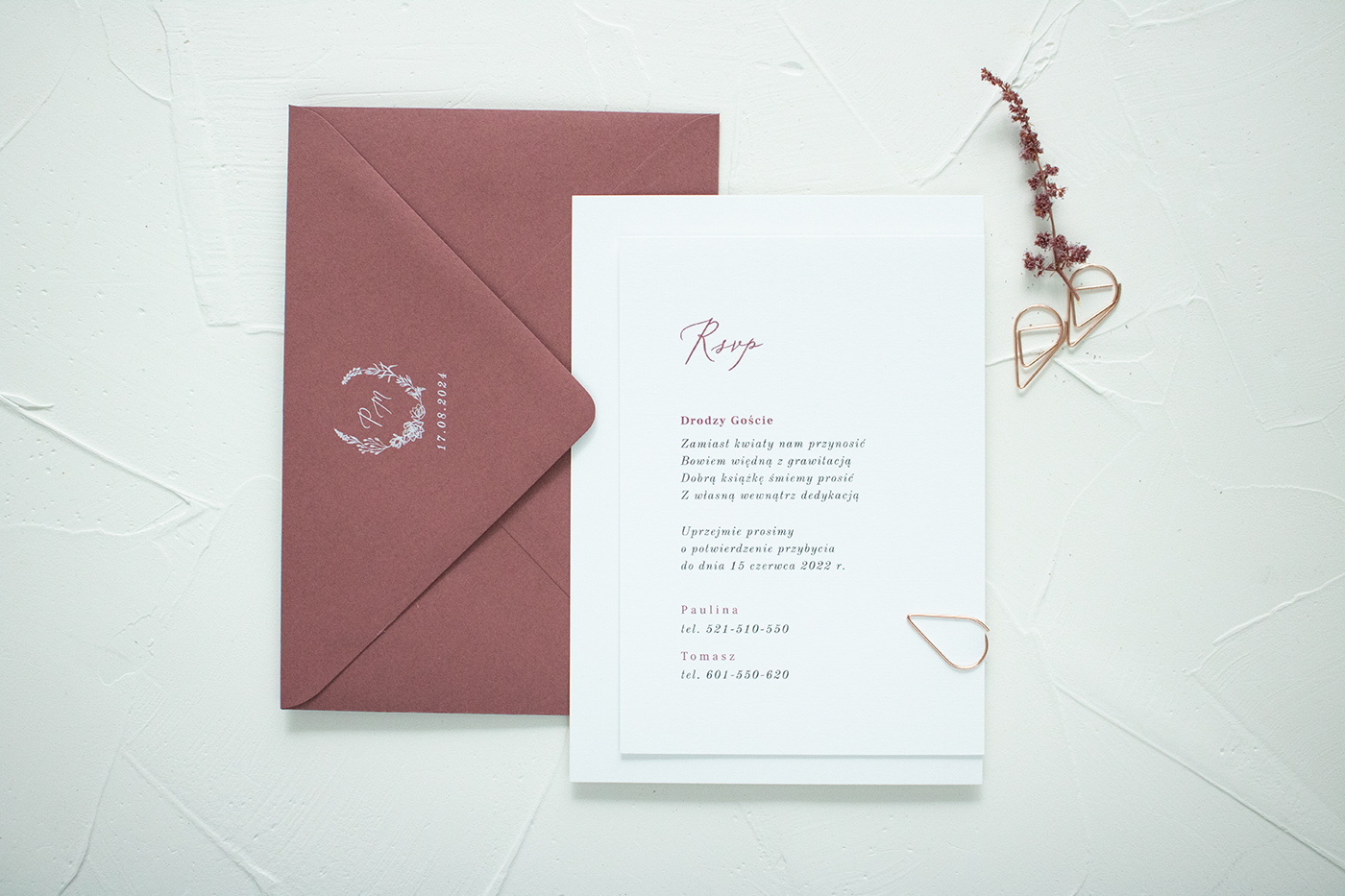 Wymiary zestawu: karta zaproszenia 170x120 mm, karta RSVP: 105x148 mm, koperta B6.