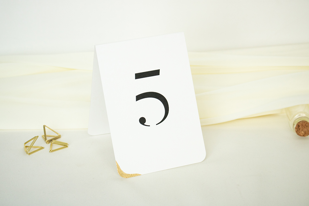 Składane numery na stół wykonane na wysokiej jakości papierze z zaokrąglonymi rogami, zdobionym delikatnie płatkami złota.