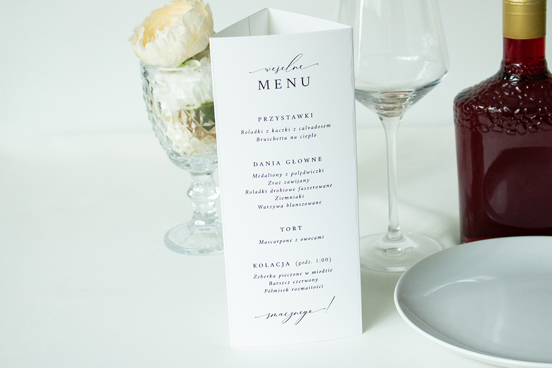 Numer stołu, menu, plan - składany trójkąt do postawienia na weselnym stole. Możliwość dowolnej zmiany treści, np. umieszczenie 2 rodzajów menu + planu wesela.