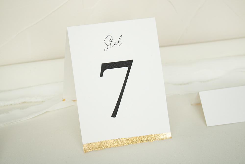 Składane numery na stół wykonane z wysokiej jakości papieru. Ręcznie rwane oraz złocone u dołu.