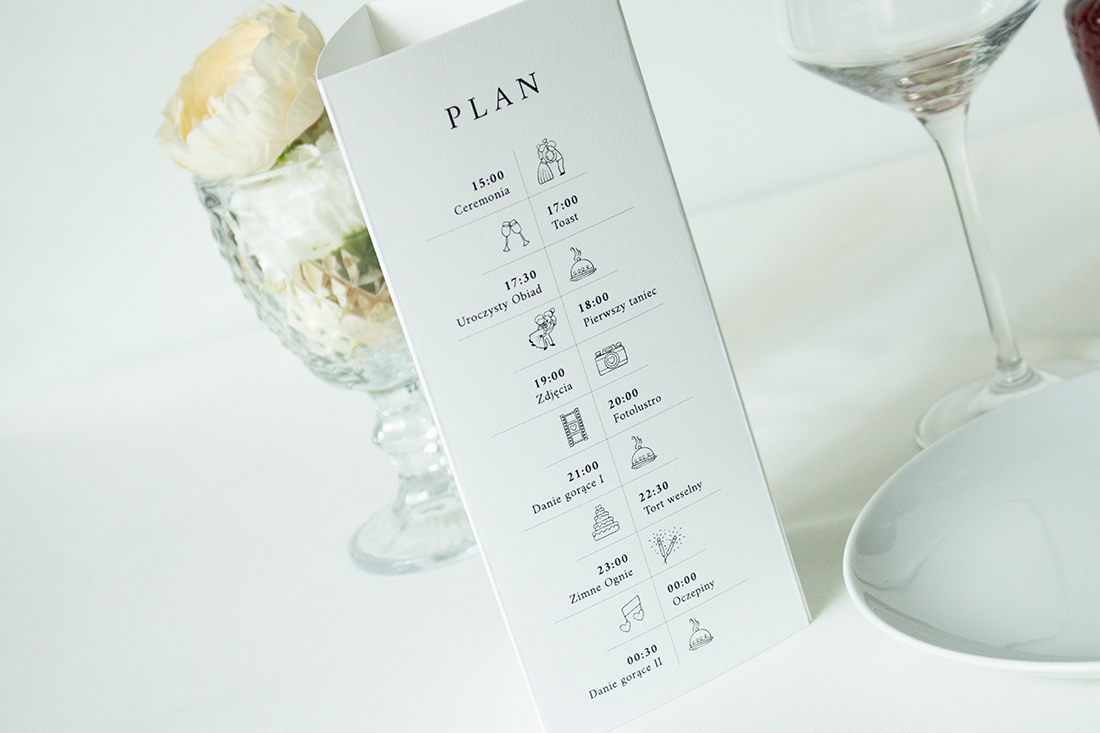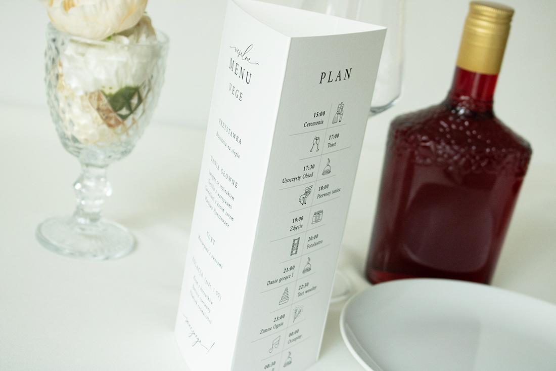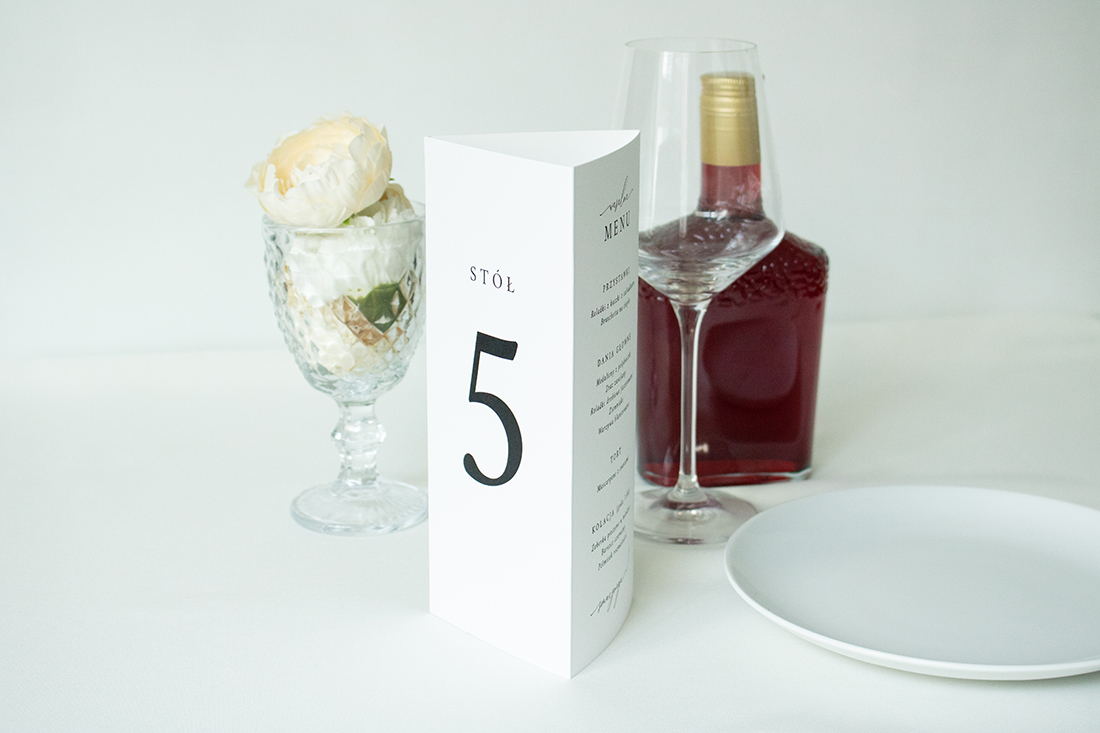 Numer stołu, menu, plan - składany trójkąt do postawienia na weselnym stole. Możliwość dowolnej zmiany treści, np. umieszczenie 2 rodzajów menu + planu wesela.