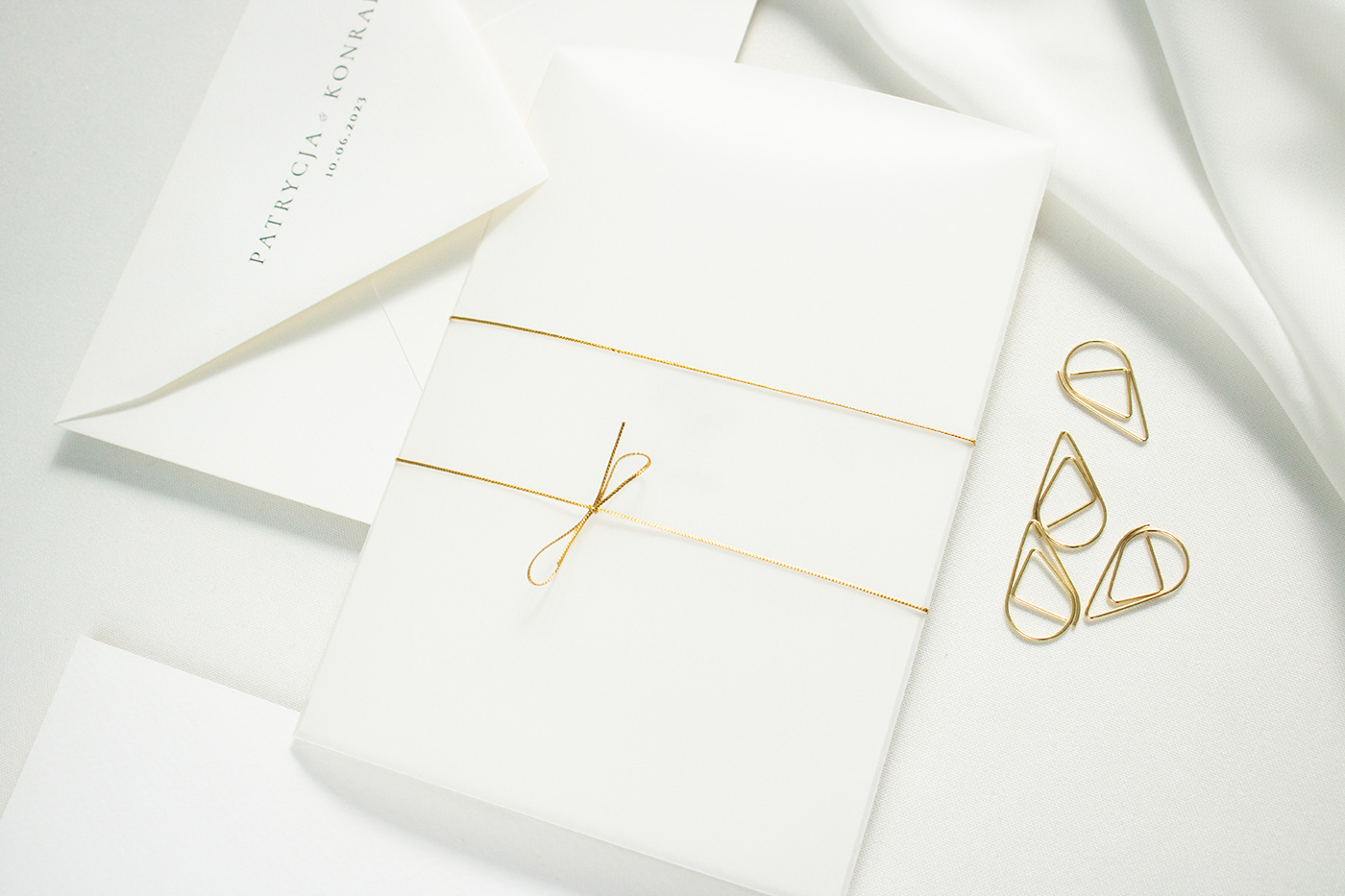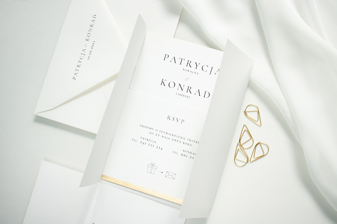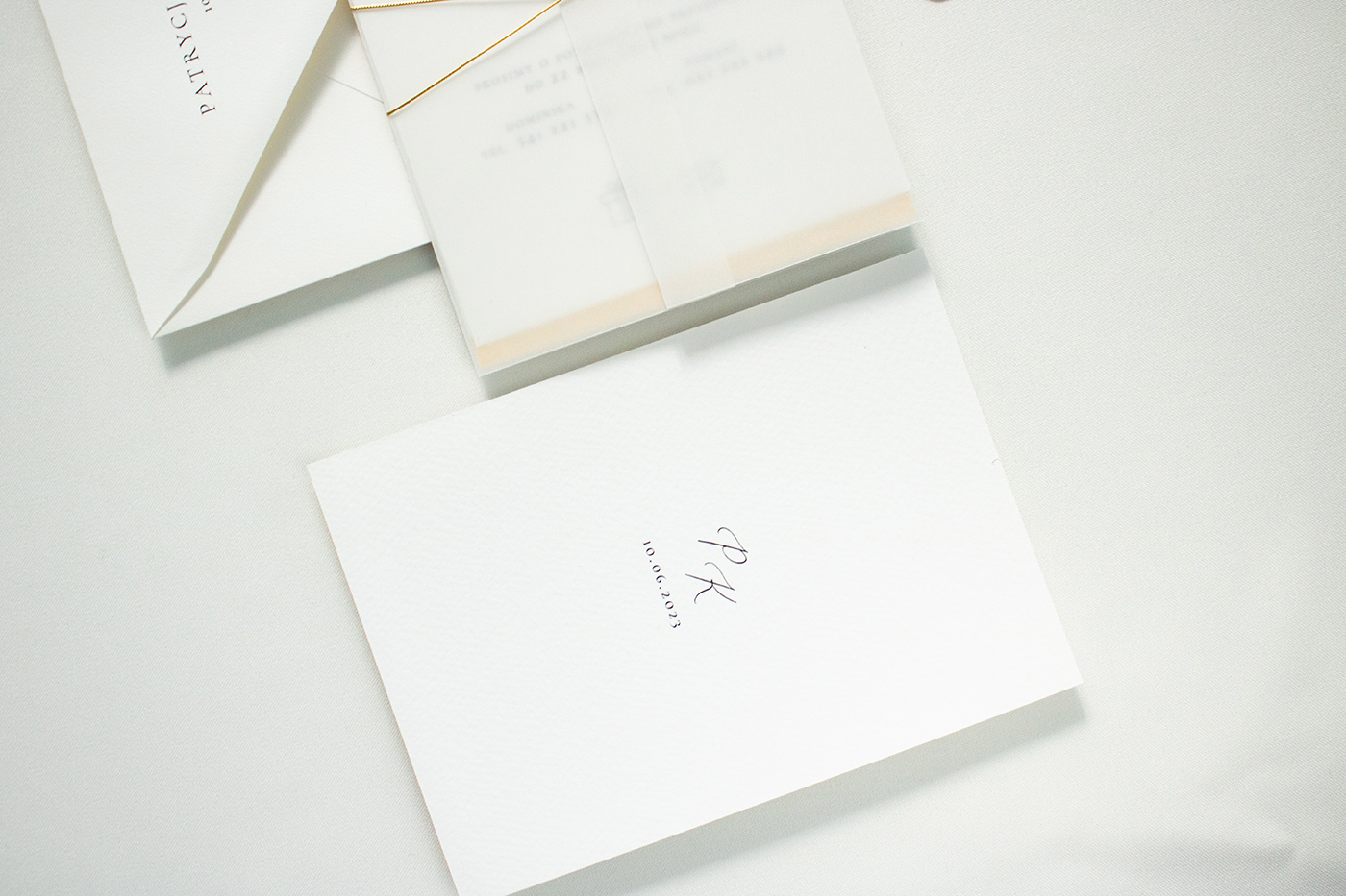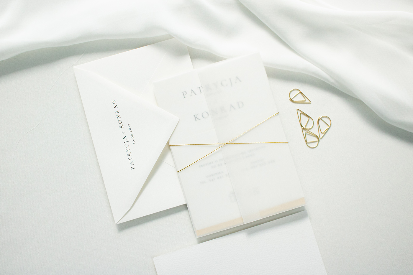Zaproszenia ślubne wykonane na wysokiej jakości papierze o gramaturze 300g. Karta zaproszenia, złocona u dołu z kartą RSVP umieszczone są w przezroczystej obwolucie (dodatkowo płatnej) wiązanej złotym sznurkiem. Do zestawu zadrukowana koperta w stylu zaproszenia.