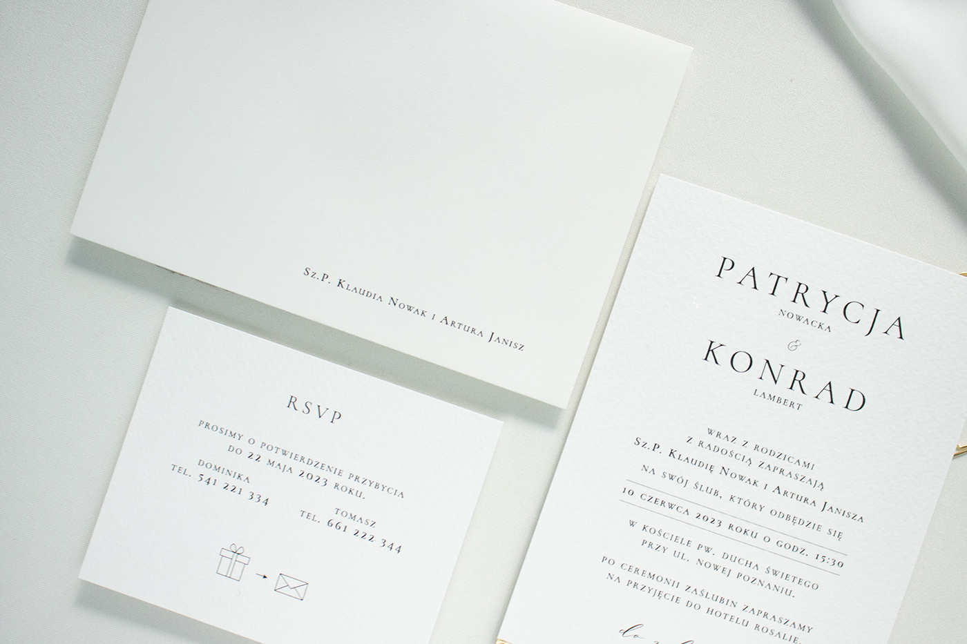 Wymiary zestawu: karta zaproszenia 170x120 mm, karta RSVP: 105x148 mm, koperta B6.