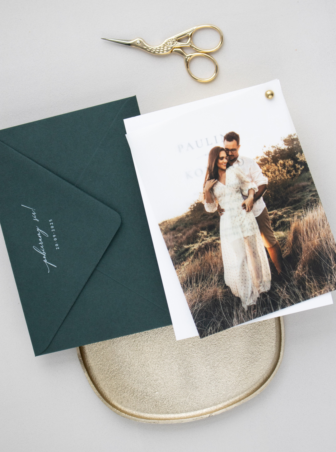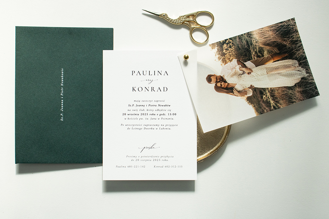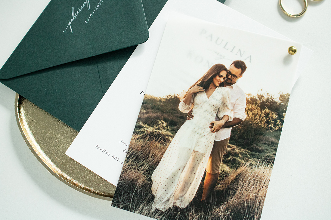 Kolekcja Photo Love wykonana na wysokiej jakości papierach w kolorze białym oraz transparentnym. Delikatnie transparentna karta ze zdjęciem oraz karta zaproszenia połączone są ozdobnym, złotym nitem. Zdjęcie należy przesłać mailowo po zakupie.