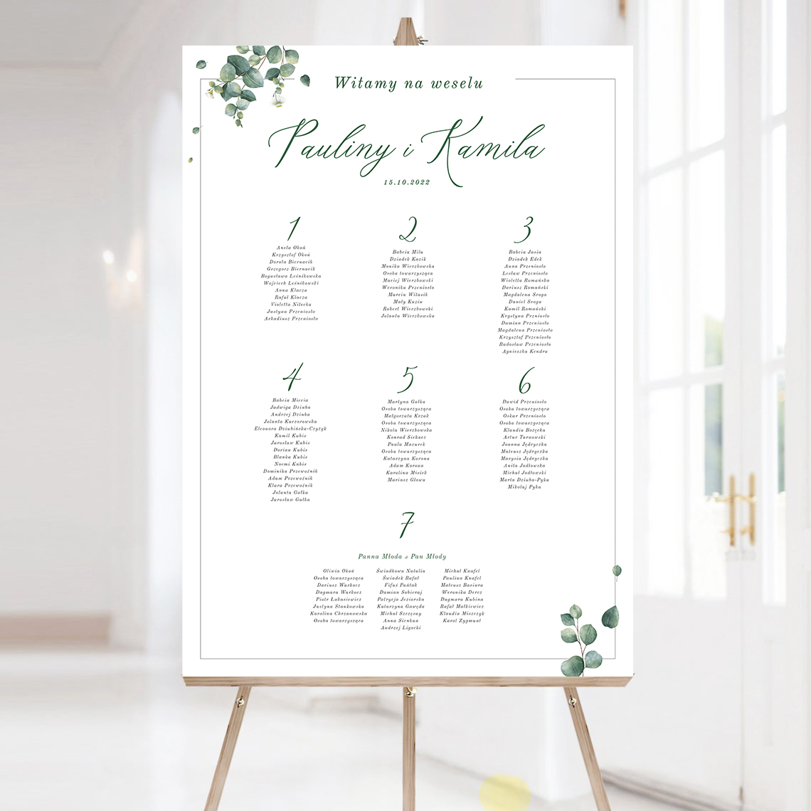 Tablica z rozmieszczeniem gości weselnych drukowana na sztywnej płycie piankowej o grubości 5 mm. Do postawienia np. na sztaludze.