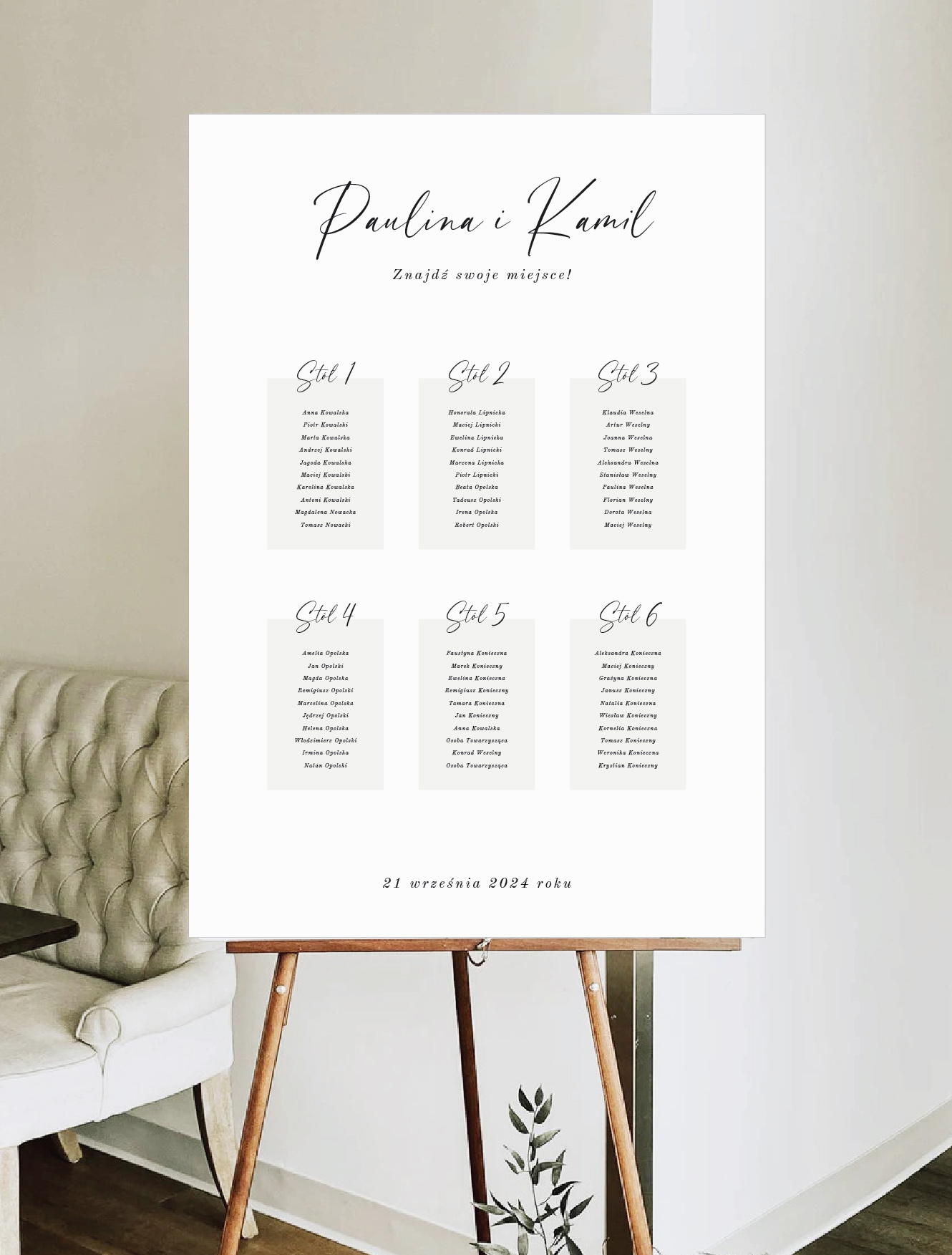 Tablica z rozmieszczeniem gości weselnych drukowana na sztywnej płycie piankowej o grubości 5 mm. Do postawienia np. na sztaludze.