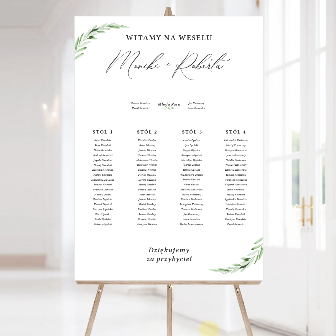 Tablica z rozmieszczeniem gości weselnych drukowana na sztywnej płycie piankowej o grubości 5 mm. Do postawienia np. na sztaludze.