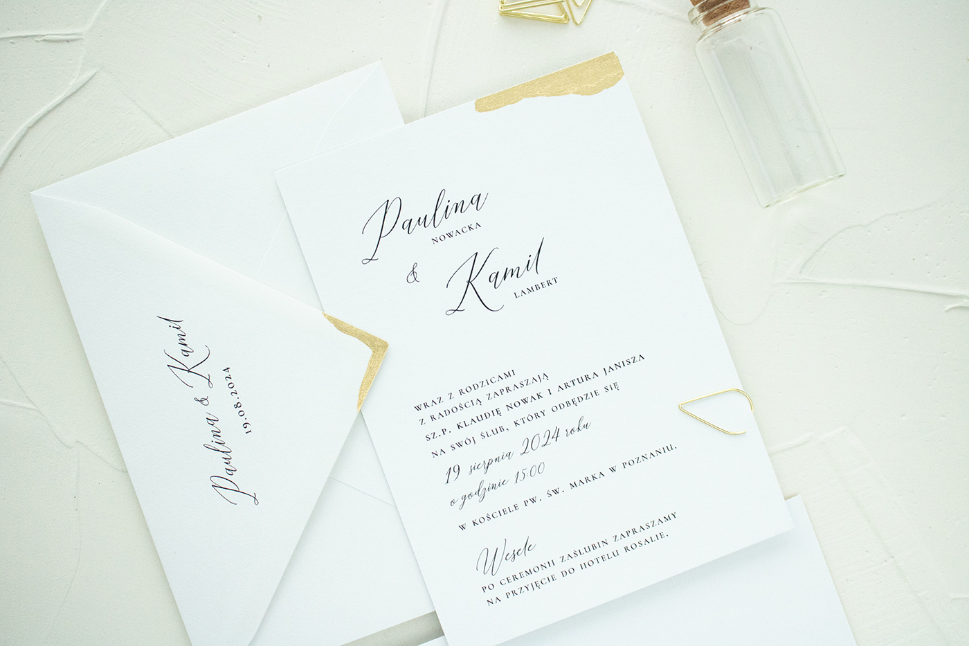Zaproszenia ślubne wykonane na wysokiej jakości papierze o gramaturze 300g. Karta zaproszenia (złocona w rogu) z kartą RSVP łączone są ozdobną spinką.