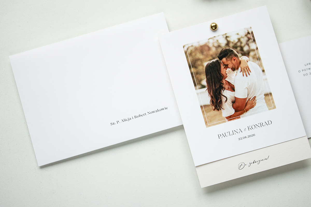 Kolekcja Simple Photo wykonana na wysokiej jakości papierach w kolorze białym oraz złamanej bieli. Karta tytułowa oraz zaproszeniowa połączone są ozdobnym, złotym nitem. Dodatkowo karta rsvp w mniejszym rozmiarze.
