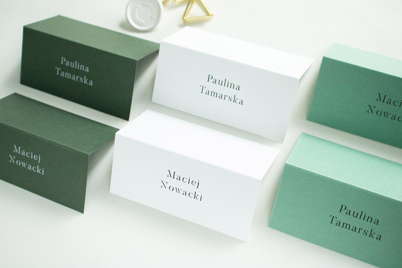 Składane winietki na stół, wykonane na wysokiej jakości papierach. Dostępne w kolorach białym, jasnozielonym oraz zgaszonej zieleni.