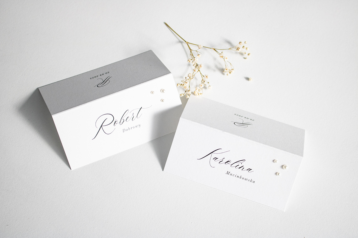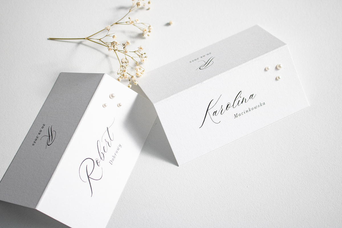 Składane winietki na stół, wykonane na wysokiej jakości papierze zdobionym perełkami.
