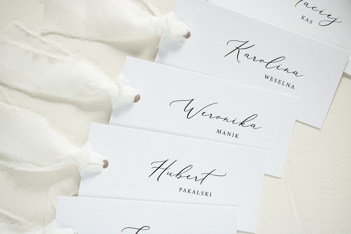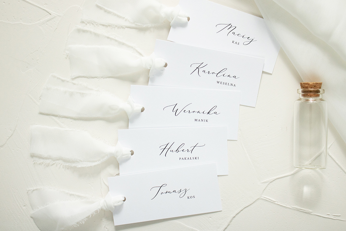 Winietki na stół, wykonane na wysokiej jakości śnieżnobiałym papierze z dodatkiem szyfonowej, ręcznie rwanej wstążki.