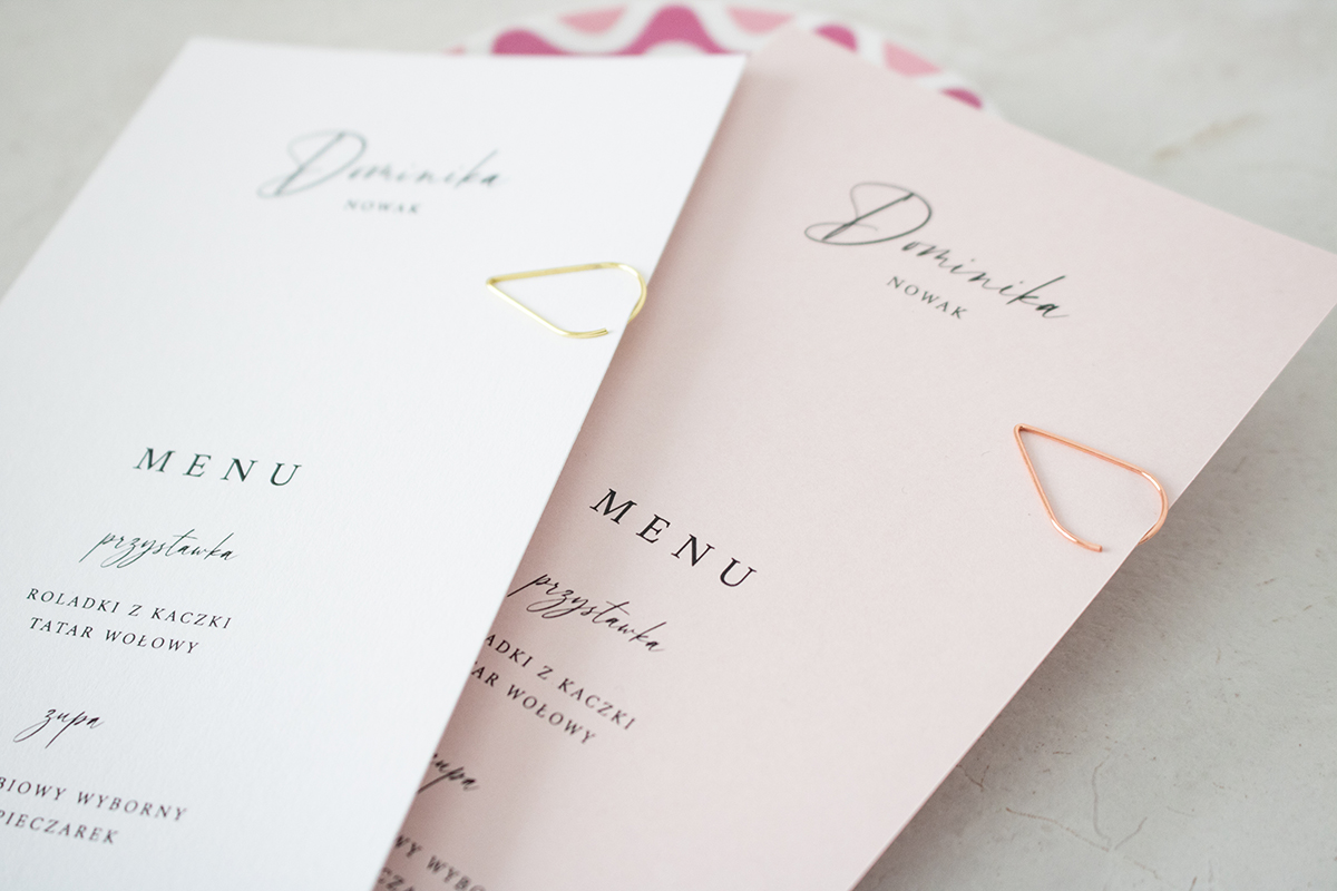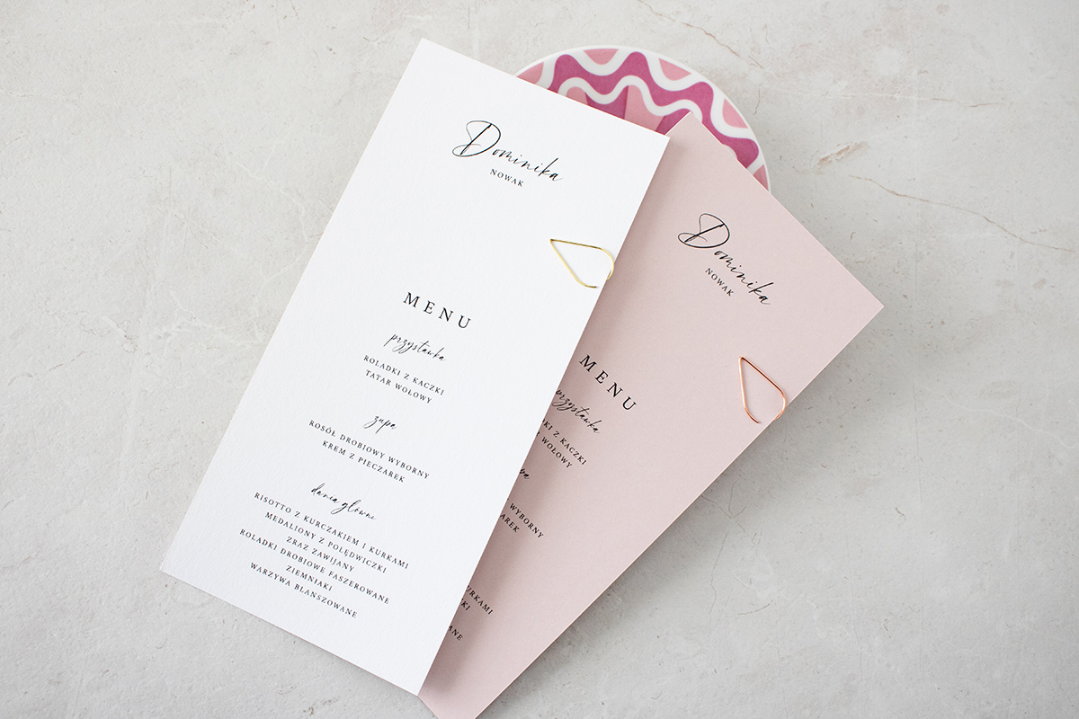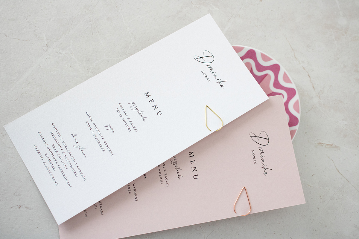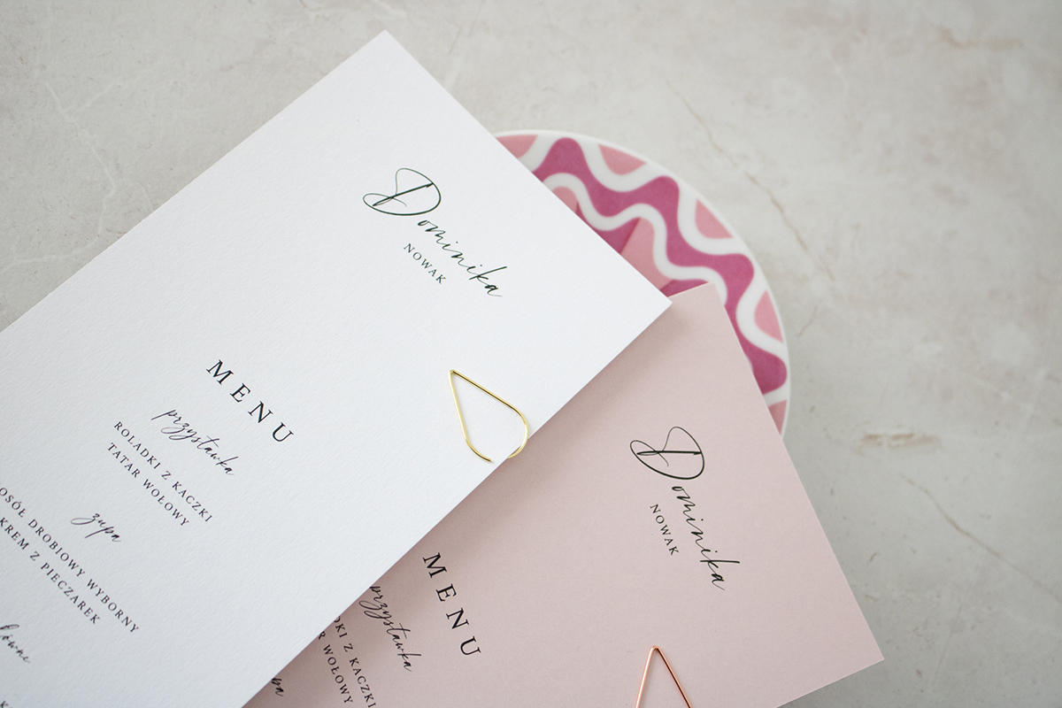 Możliwość dopasowania czcionki winietki pod zaprojektowane zaproszenie oraz zmiana koloru spinki i karty menu/winietki.