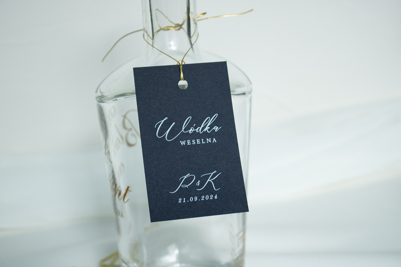 Zawieszka wykonana na wysokiej jakości papierze granatowym z białym nadrukiem.. Wiązana za pomocą ozdobnego, złotego sznurka.