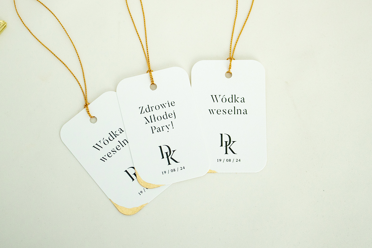 Zawieszka wykonana na wysokiej jakości papierze z zaokrąglonymi brzegami, wiązana za pomocą ozdobnego, złotego sznurka oraz zdobiona płatkami złota.
