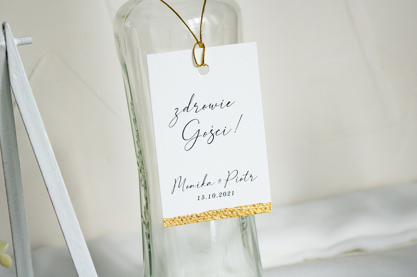 Złocona zawieszka na butelki wykonana na wysokiej jakości papierze. Wiązana za pomocą ozdobnego, złotego sznurka.